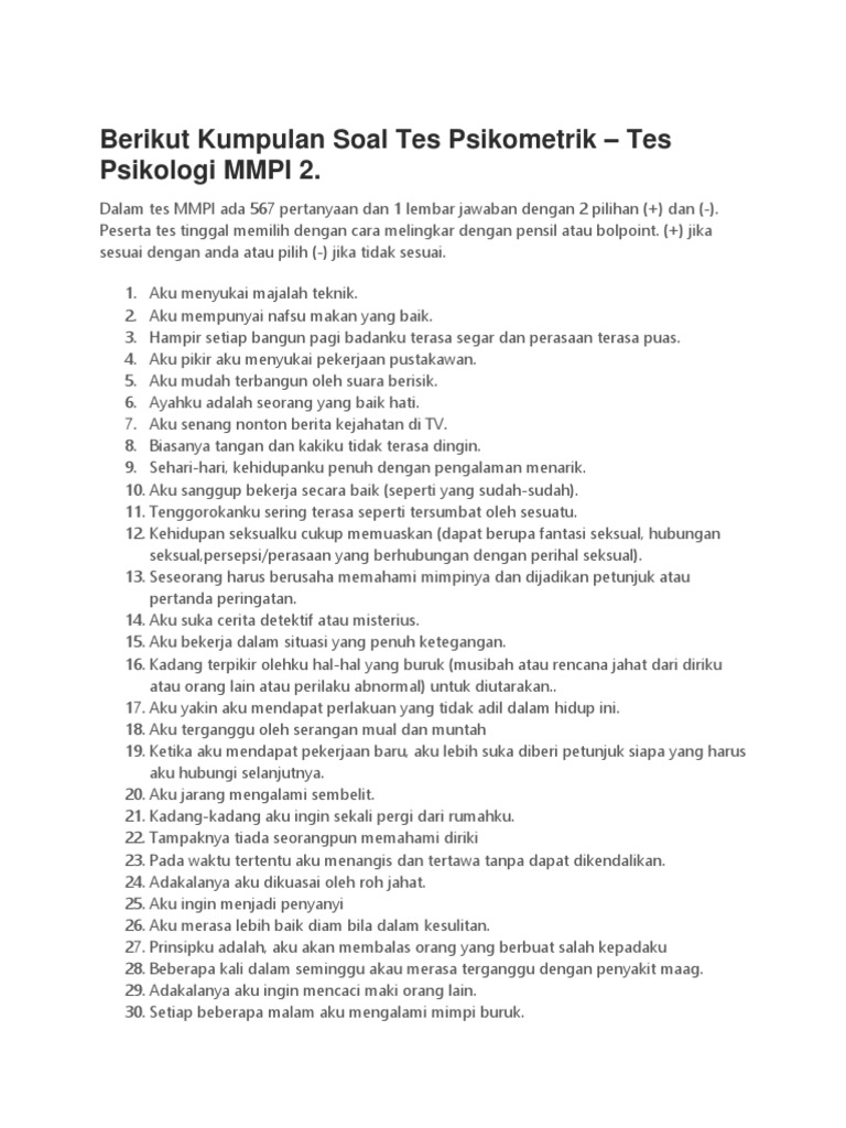 More images for contoh soal mmpi dan jawabannya » Contoh soal tes mmpi dan jawabannya tes soal ialah sebuah fasilitas atau prosedur yg terstruktur dan objektif buat meraih sejumlah data atau keterangan yang di inginkan berkenaan seorang dgn cara yg cepat pasdari pernyataan tersebut bisa disimpulkan bahwa di dalamnya terkandung berbagai pengertian. Aug 19, 2019 · contoh soal tes mmpi dan jawabannya 2019 doggie lidi soal tes mmpi 2 dan jawabannya, contoh soal tes mmpi dan jawabannya tes soal ialah sebuah fasilitas atau prosedur yg terstruktur dan objektif buat meraih sejumlah data atau keterangan yang di inginkan berkenaan seorang dgn cara yg cepat pas dari pernyataan tersebut bisa disimpulkan bahwa di dalamnya terkandung berbagai pengertian a tes itu hanya yakni alat bukan tujuan Contoh soal tes mmpi dan jawaban. Contoh soal dan juga jawaban keswa kesehatan jiwa polri pada kesempatan kali ini saya bagikan mengenai contoh soal tes kesehatan jiwa yang akan di lakukan sebelum melaksanakan urutan urutan tes di polri yaitu pada kesehatan jiwa atau di sebut dengan keswa yang banyak calon calon siswa polri sering gagal di tahap ini padahal bentuk tesnya.