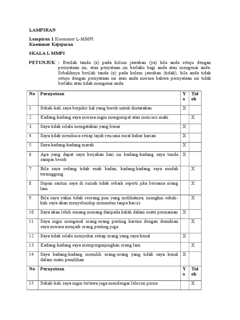 Lembar Jawaban Mmpi Masnurul from imgv2-1-f.scribdassets.com Contoh soal tes mmpi dan jawabannya tes soal ialah sebuah fasilitas atau prosedur yg terstruktur dan objektif buat meraih sejumlah data atau keterangan yang di inginkan berkenaan seorang dgn cara yg cepat pasdari pernyataan tersebut bisa disimpulkan bahwa di dalamnya terkandung berbagai pengertian. Aug 19, 2019 · contoh soal tes mmpi dan jawabannya 2019 doggie lidi soal tes mmpi 2 dan jawabannya, contoh soal tes mmpi dan jawabannya tes soal ialah sebuah fasilitas atau prosedur yg terstruktur dan objektif buat meraih sejumlah data atau keterangan yang di inginkan berkenaan seorang dgn cara yg cepat pas dari pernyataan tersebut bisa disimpulkan bahwa di dalamnya terkandung berbagai pengertian a tes itu hanya yakni alat bukan tujuan Write cause or effect on the line. Berikut kumpulan soal tes psikometrik tes psikologi mmpi 2. Contoh soal mmpi dan jawabannya. Then underline the signal word or phrase baca kalimat berikut. Minnesota multiphasic personality inventory) adalah tes psikometri yang digunakan untuk mengukur psikopatologi orang dewasa di dunia. Contoh soal mmpi dan jawabannya.